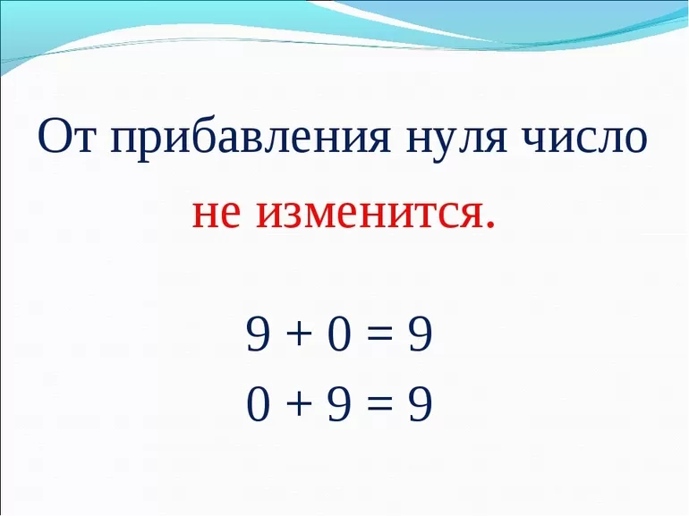 Прибавление нуля к любому числу дает то же число. Данное правило возможно записать в виде равенства: a + 0 = a